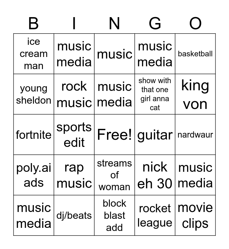 This bingo card has a free space and 29 words: music media, 2k, sports edit, if u missed nba dude, ice cream man, music, rock music, rap music, guitar, dj/beats, nardwaur, movie clips, block blast add, rocket league, king von, crimge memes, streams of woman, poly.ai ads, basketball, fortnite, nick eh 30, the middle, show with that one girl anna cat, young sheldon, music media, music media, music media, music media and music media.