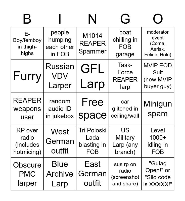 This bingo card has a free space and 24 words: West German outfit, Blue Archive Larp, GFL Larp, Obscure PMC larper, moderator event (Coma, Aerisk, Feline, Holo), E-Boy/femboy in thigh-highs, Furry, people humping each other in FOB, car glitched in ceiling/wall, Tri Poloski Lada blasting in FOB, Task-Force REAPER larp, REAPER weapons user, US Military Larp (any branch), Level 1000+ idling in FOB, Russian VDV Larper, sus rp on radio (screenshot and share), Minigun spam, M1014 REAPER Spammer, MVIP EOD Suit (new MVIP buyer guy), random audio ID in jukebox, "Gulag Open!" or "Silo code is XXXXX!", RP over radio (includes hotmicing), boat chilling in FOB garage and East German outfit.
