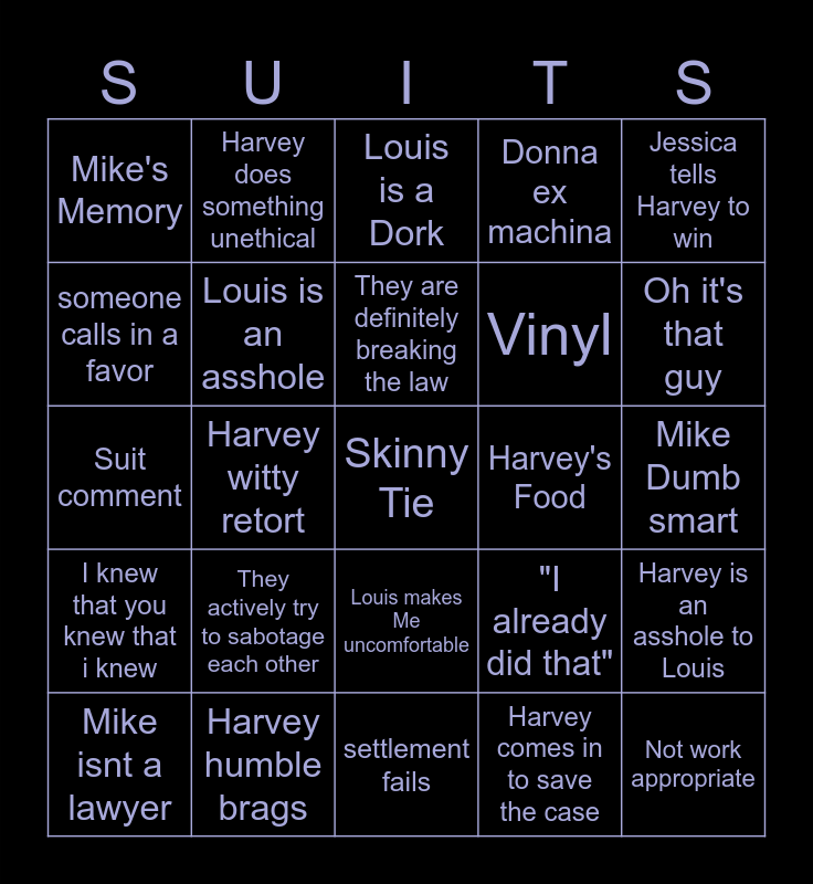This bingo card has a free space and 32 words: Harvey comes in to save the case, Court room, Harvey witty retort, Mike wants help, told to figure it out, I knew that you knew that i knew, Louis is an asshole, Jessica tells Harvey to win, Harvey is an asshole to Louis, Harvey does something unethical, Harvey preaches about ethics, They are definitely breaking the law, Louis is a Dork, That gives me an idea, Harvey has stupid metaphor, Harvey's Food, Jessica smiles, Mike isnt a lawyer, Suit comment, Louis makes Me uncomfortable, They actively try to sabotage each other, "I already did that", Definitely "NY", Mike Dumb smart, Harvey humble brags, Not work appropriate, Donna ex machina, Vinyl, someone calls in a favor, Mike's Memory, settlement fails, confrontation outside the office and Oh it's that guy.