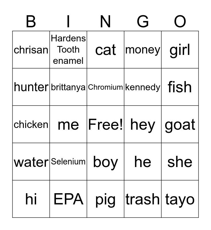 This bingo card has a free space and 24 words: Selenium, EPA, Chromium, hi, girl, chrisan, hunter, Hardens Tooth enamel, hey, boy, kennedy, chicken, he, she, brittanya, trash, goat, cat, fish, me, tayo, water, money and pig.