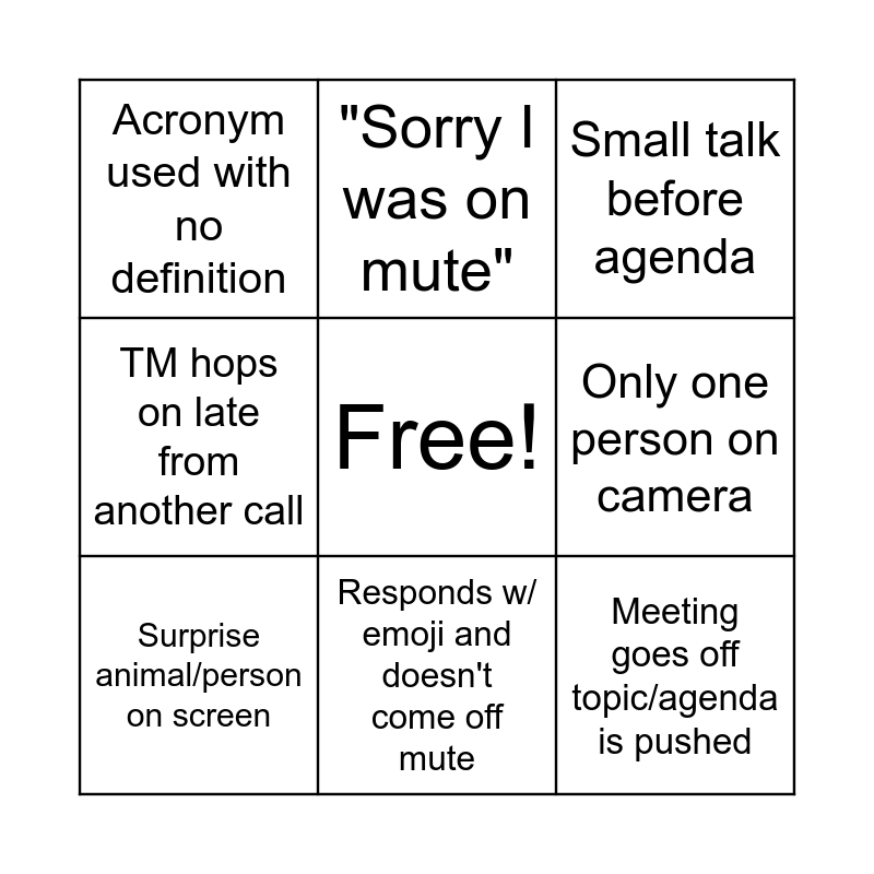 This bingo card has a free space and 8 words: Only one person on camera, Small talk before agenda, "Sorry I was on mute", Surprise animal/person on screen, Acronym used with no definition, Meeting goes off topic/agenda is pushed, TM hops on late from another call and Responds w/ emoji and doesn't come off mute.