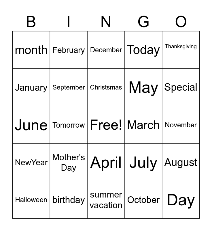 This bingo card has a free space and 24 words: Mother's Day, birthday, Christsmas, Halloween, Thanksgiving, month, January, February, March, April, May, June, July, August, September, October, November, December, Special, Tomorrow, Day, NewYear, Today and summer vacation.