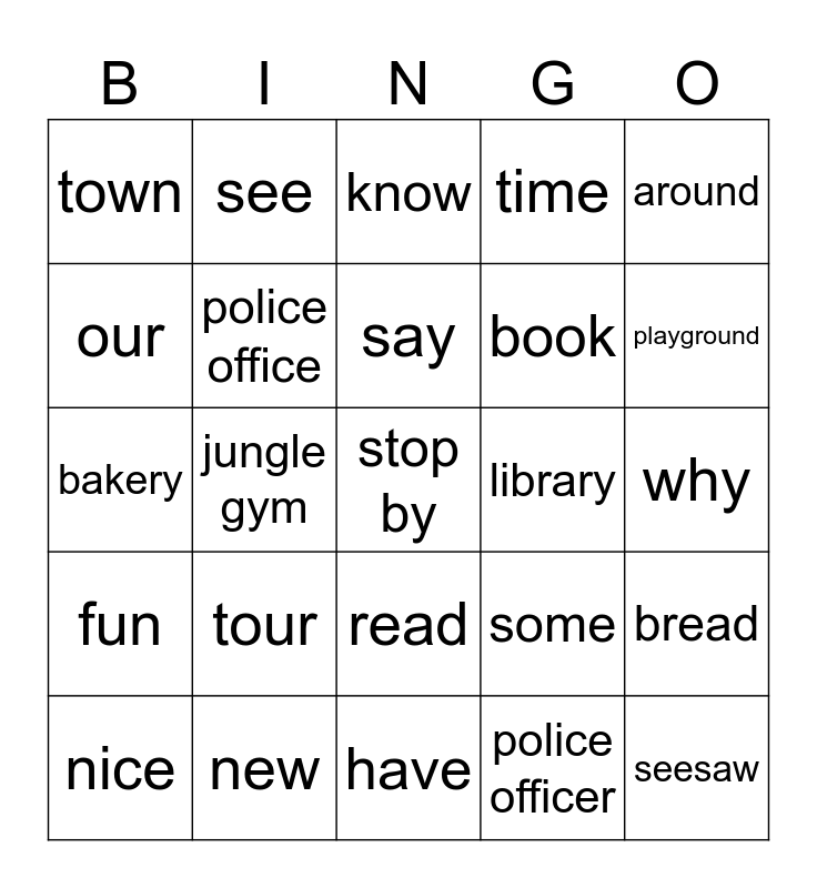 This bingo card has a free space and 24 words: tour, new, say, nice, around, town, our, see, library, read, book, bakery, some, bread, police office, police officer, why, know, playground, jungle gym, seesaw, fun, time and have.