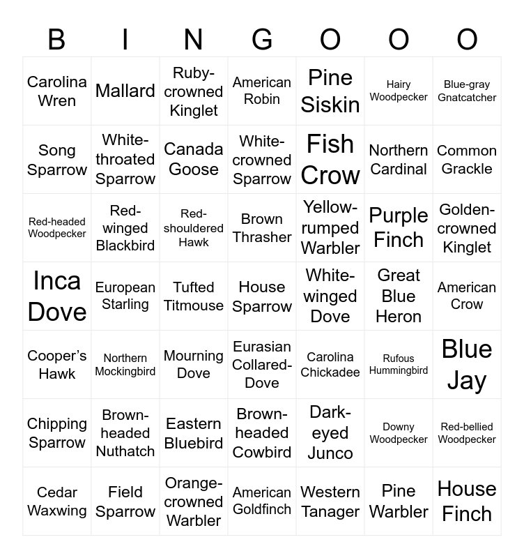 This bingo card has a free space and 48 words: Dark-eyed Junco, Northern Cardinal, American Goldfinch, European Starling, Red-shouldered Hawk, American Crow, Mallard, Field Sparrow, Hairy Woodpecker, Eurasian Collared-Dove, Blue-gray Gnatcatcher, American Robin, Purple Finch, Yellow-rumped Warbler, Chipping Sparrow, Great Blue Heron, Song Sparrow, Common Grackle, Downy Woodpecker, Pine Siskin, Fish Crow, Tufted Titmouse, Carolina Wren, White-throated Sparrow, Red-bellied Woodpecker, Canada Goose, Golden-crowned Kinglet, Cedar Waxwing, Brown Thrasher, Red-winged Blackbird, Pine Warbler, White-winged Dove, Blue Jay, Brown-headed Nuthatch, Inca Dove, Carolina Chickadee, Rufous Hummingbird, Red-headed Woodpecker, Mourning Dove, Eastern Bluebird, Cooper’s Hawk, House Finch, Ruby-crowned Kinglet, Orange-crowned Warbler, White-crowned Sparrow, Brown-headed Cowbird, Northern Mockingbird and Western Tanager.