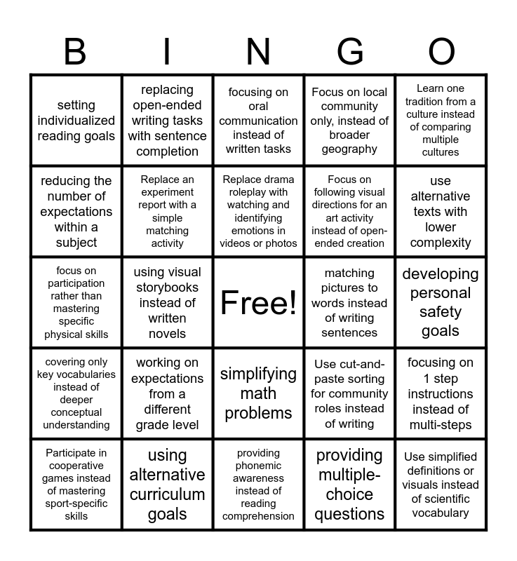 This bingo card has a free space and 24 words: working on expectations from a different grade level, using alternative curriculum goals, Replace drama roleplay with watching and identifying emotions in videos or photos, Participate in cooperative games instead of mastering sport-specific skills, Learn one tradition from a culture instead of comparing multiple cultures, setting individualized reading goals, reducing the number of expectations within a subject, replacing open-ended writing tasks with sentence completion, matching pictures to words instead of writing sentences, simplifying math problems, Focus on following visual directions for an art activity instead of open-ended creation, focus on participation rather than mastering specific physical skills, Use cut-and-paste sorting for community roles instead of writing, focusing on 1 step instructions instead of multi-steps, Replace an experiment report with a simple matching activity, providing multiple-choice questions, developing personal safety goals, focusing on oral communication instead of written tasks, use alternative texts with lower complexity, using visual storybooks instead of written novels, Use simplified definitions or visuals instead of scientific vocabulary, covering only key vocabularies instead of deeper conceptual understanding, Focus on local community only, instead of broader geography and providing phonemic awareness instead of reading comprehension.
