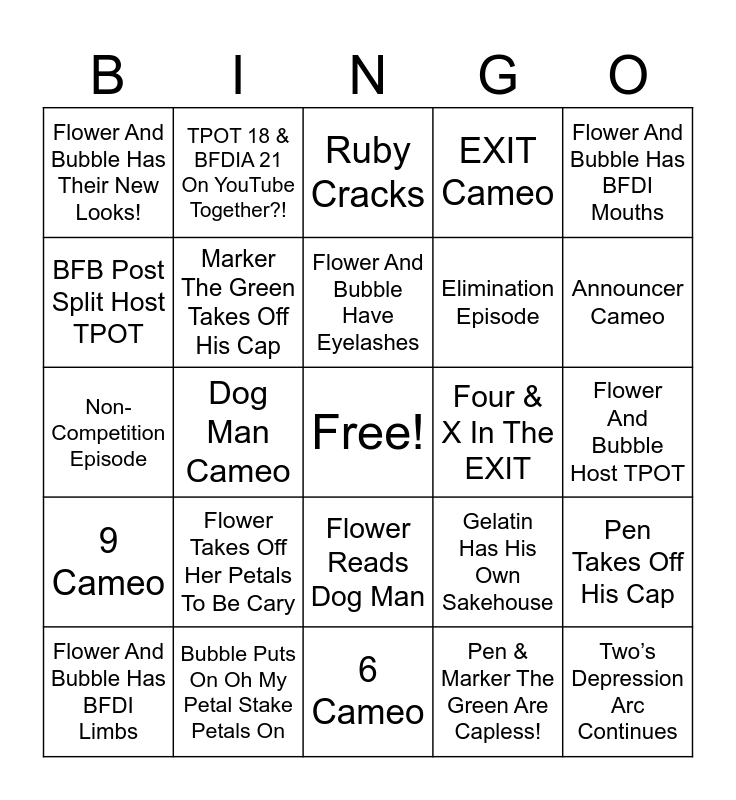This bingo card has a free space and 24 words: Flower Takes Off Her Petals To Be Cary, Bubble Puts On Oh My Petal Stake Petals On, Flower And Bubble Have Eyelashes, Flower And Bubble Has BFDI Limbs, Flower And Bubble Has BFDI Mouths, Flower And Bubble Has Their New Looks!, BFB Post Split Host TPOT, TPOT 18 & BFDIA 21 On YouTube Together?!, Four & X In The EXIT, Flower Reads Dog Man, Elimination Episode, Non-Competition Episode, Gelatin Has His Own Sakehouse, Pen Takes Off His Cap, Marker The Green Takes Off His Cap, Pen & Marker The Green Are Capless!, Flower And Bubble Host TPOT, Ruby Cracks, Announcer Cameo, Dog Man Cameo, Two’s Depression Arc Continues, 9 Cameo, EXIT Cameo and 6 Cameo.
