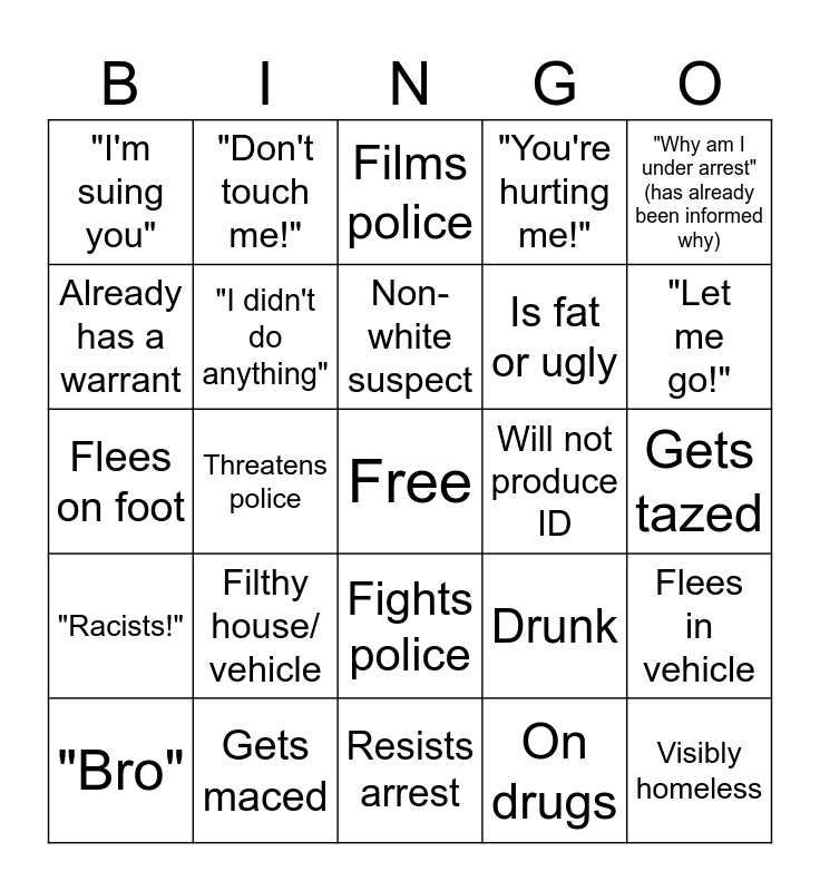 This bingo card has a free space and 24 words: Filthy house/ vehicle, Gets maced, Non-white suspect, "Bro", "Why am I under arrest" (has already been informed why), "I'm suing you", Already has a warrant, "Don't touch me!", Will not produce ID, Fights police, Is fat or ugly, Flees on foot, Drunk, Flees in vehicle, "I didn't do anything", On drugs, Gets tazed, Films police, "Let me go!", Threatens police, Visibly homeless, "Racists!", "You're hurting me!" and Resists arrest.