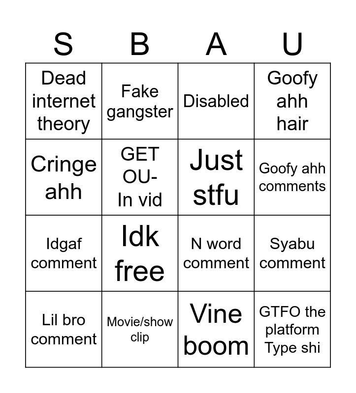 This bingo card has 16 words: Lil bro comment, Movie/show clip, Disabled, Goofy ahh hair, Cringe ahh, Fake gangster, N word comment, Syabu comment, Dead internet theory, GET OU- In vid, Vine boom, Goofy ahh comments, Idgaf comment, Idk free, Just stfu and GTFO the platform Type shi.