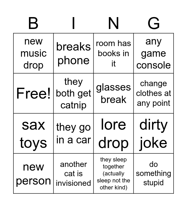 This bingo card has 16 words: another cat is invisioned, dirty joke, room has books in it, new music drop, sax toys, breaks phone, lore drop, they sleep together (actually sleep not the other kind), Free!, they both get catnip, new person, any game console, they go in a car, change clothes at any point, glasses break and do something stupid.