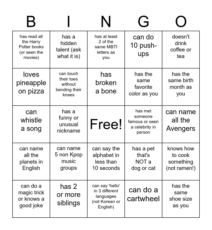 This bingo card has a free space and 24 words: can name 5 non Kpop music groups, has 2 or more siblings, has broken a bone, can do a magic trick or knows a good joke, doesn't drink coffee or tea, has read all the Harry Potter books (or seen the movies), loves pineapple on pizza, has a hidden talent (ask what it is), has met someone famous or seen a celebrity in person, can say the alphabet in less than 10 seconds, has the same favorite color as you, can whistle a song, has a pet that's NOT a dog or cat, knows how to cook something (not ramen!), can touch their toes without bending their knees, can do a cartwheel, can name all the Avengers, has at least 2 of the same MBTI letters as you, has the same birth month as you, has a funny or unusual nickname, has the same shoe size as you, can name all the planets in English, can do 10 push-ups and can say 'hello' in 3 different languages (not Korean or English).