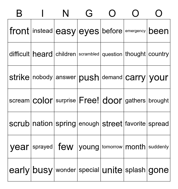 This bingo card has a free space and 48 words: tomorrow, thought, special, color, answer, brought, instead, busy, emergency, enough, been, eyes, carry, demand, year, gathers, difficult, country, month, before, question, surprise, front, heard, suddenly, children, your, early, push, nobody, splash, door, spread, sprayed, scream, street, favorite, strike, spring, few, scrub, gone, easy, wonder, scrambled, young, nation and unite.