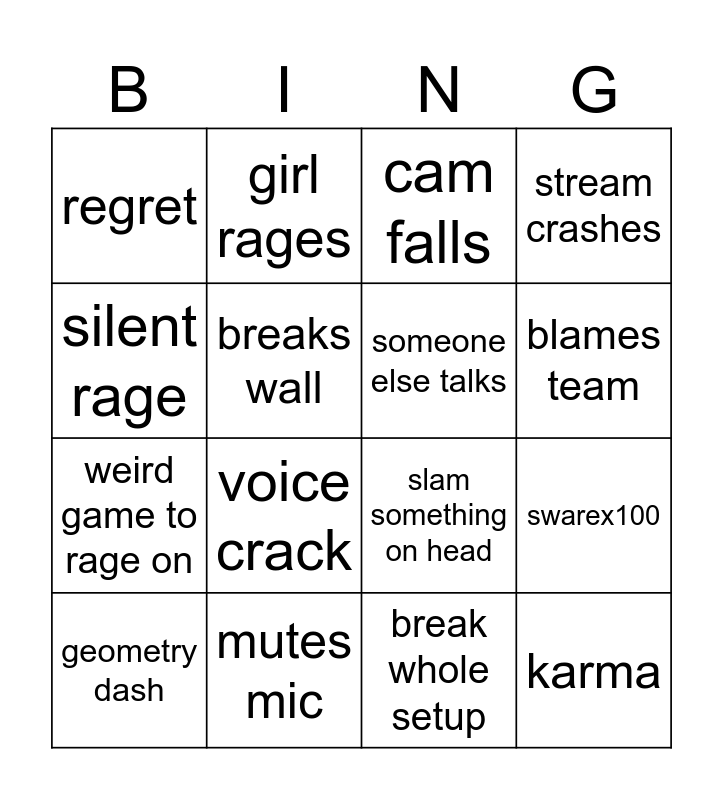 This bingo card has 16 words: mutes mic, swarex100, cam falls, regret, weird game to rage on, girl rages, slam something on head, break whole setup, silent rage, breaks wall, geometry dash, stream crashes, voice crack, blames team, someone else talks and karma.