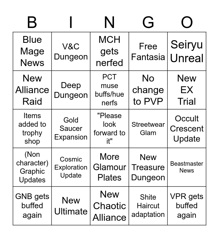 This bingo card has a free space and 24 words: Cosmic Exploration Update, New Ultimate, PCT muse buffs/hue nerfs, GNB gets buffed again, Seiryu Unreal, Blue Mage News, New Alliance Raid, V&C Dungeon, Streetwear Glam, More Glamour Plates, No change to PVP, Items added to trophy shop, New Treasure Dungeon, Beastmaster News, Deep Dungeon, Shite Haircut adaptation, Occult Crescent Update, MCH gets nerfed, New EX Trial, Gold Saucer Expansion, VPR gets buffed again, (Non character) Graphic Updates, Free Fantasia and New Chaotic Alliance.