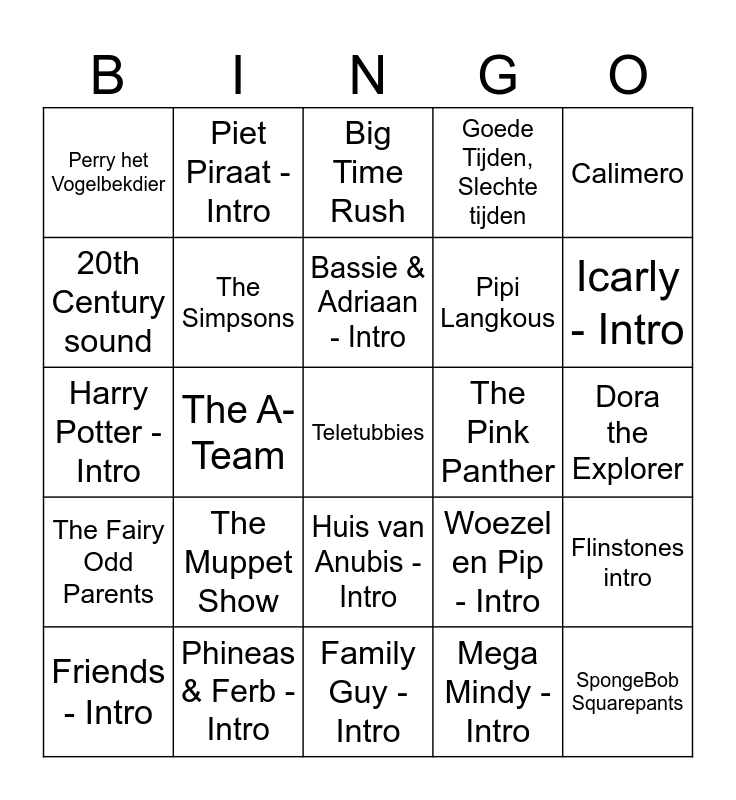 This bingo card has a free space and 38 words: De Smurfen - Kom naar smurfenland, Bumba - Intro, Thomas de Stoomlocomotief - Intro, The Simpsons, Flinstones intro, The Muppet Show, Bassie & Adriaan - Intro, Sesamstraat - intro, Calimero, Pipi Langkous, The A-Team, Goede Tijden, Slechte tijden, SpongeBob Squarepants, Dora the Explorer, 20th Century sound, The Fairy Odd Parents, Jimmy Neutron, Big Time Rush, Big bang Theory, The Pink Panther, Perry het Vogelbekdier, Phineas & Ferb - Intro, Icarly - Intro, Friends - Intro, Victorious - Intro, Family Guy - Intro, Bob’s Burger - Intro, Nijntje - Intro, Power Rangers - Intro, Rocket Power - Intro, Pokémon Theme Song, Huis van Anubis - Intro, Mega Mindy - Intro, Piet Piraat - Intro, Bob de Bouwer - Intro, Woezel en Pip - Intro, Harry Potter - Intro and Duck Tales - Intro.