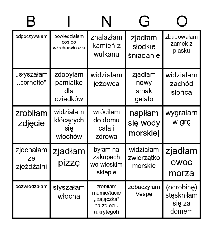 This bingo card has a free space and 24 words: zjadłam pizzę, słyszałam włocha, widziałam jeżowca, pozwiedzałam, zbudowałam zamek z piasku, odpoczywałam, usłyszałam ,,cornetto'', powiedziałam coś do włocha/włoszki, napiłam się wody morskiej, byłam na zakupach we włoskim sklepie, zjadłam nowy smak gelato, zrobiłam zdjęcie, widziałam zwierzątko morskie, zjadłam owoc morza, zdobyłam pamiątkę dla dziadków, zobaczyłam Vespę, wygrałam w grę, znalazłam kamień z wulkanu, widziałam zachód słońca, widziałam kłócących się włochów, (odrobinę) stęskniłam się za domem, zjechałam ze zjeżdżalni, zjadłam słodkie śniadanie and zrobiłam mamie/tacie ,,zajączka'' na zdjęciu (ukrytego!).