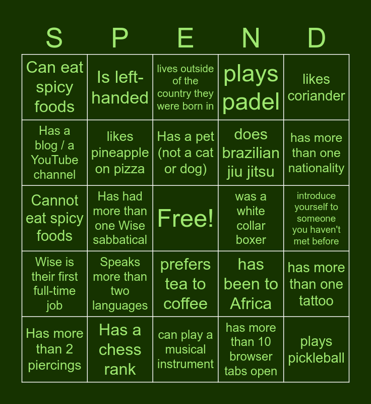 This bingo card has a free space and 24 words: Speaks more than two languages, Has a chess rank, Has a pet (not a cat or dog), Has more than 2 piercings, likes coriander, Can eat spicy foods, Has a blog / a YouTube channel, Is left-handed, was a white collar boxer, prefers tea to coffee, does brazilian jiu jitsu, Cannot eat spicy foods, has been to Africa, has more than one tattoo, likes pineapple on pizza, has more than 10 browser tabs open, introduce yourself to someone you haven't met before, lives outside of the country they were born in, has more than one nationality, Has had more than one Wise sabbatical, plays pickleball, Wise is their first full-time job, plays padel and can play a musical instrument.