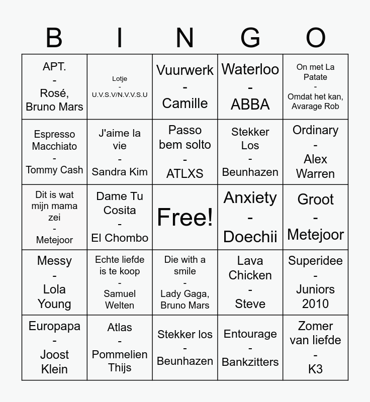 This bingo card has a free space and 24 words: Echte liefde is te koop - Samuel Welten, Atlas - Pommelien Thijs, Passo bem solto - ATLXS, Europapa - Joost Klein, On met La Patate - Omdat het kan, Avarage Rob, APT. - Rosé, Bruno Mars, Espresso Macchiato - Tommy Cash, Lotje - U.V.S.V/N.V.V.S.U, Anxiety - Doechii, Die with a smile - Lady Gaga, Bruno Mars, Stekker Los - Beunhazen, Dit is wat mijn mama zei - Metejoor, Lava Chicken - Steve, Superidee - Juniors 2010, J'aime la vie - Sandra Kim, Entourage - Bankzitters, Groot - Metejoor, Vuurwerk - Camille, Ordinary - Alex Warren, Dame Tu Cosita - El Chombo, Zomer van liefde - K3, Messy - Lola Young, Waterloo - ABBA and Stekker los - Beunhazen.