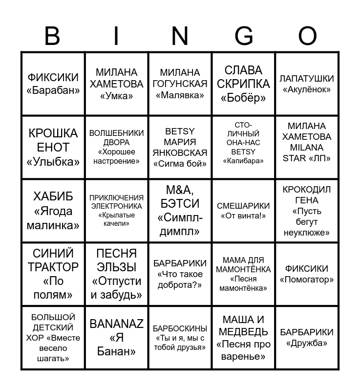 This bingo card has 25 words: ПЕСНЯ ЭЛЬЗЫ «Отпусти и забудь», БАРБОСКИНЫ «Ты и я, мы с тобой друзья», BETSY МАРИЯ ЯНКОВСКАЯ «Сигма бой», БОЛЬШОЙ ДЕТСКИЙ ХОР «Вместе весело шагать», ЛАПАТУШКИ «Акулёнок», ФИКСИКИ «Барабан», КРОШКА ЕНОТ «Улыбка», МИЛАНА ХАМЕТОВА «Умка», СМЕШАРИКИ «От винта!», БАРБАРИКИ «Что такое доброта?», СТО-ЛИЧНЫЙ ОНА-НАС BETSY «Капибара», ХАБИБ «Ягода малинка», МАМА ДЛЯ МАМОНТЁНКА «Песня мамонтёнка», ФИКСИКИ «Помогатор», ВОЛШЕБНИКИ ДВОРА «Хорошее настроение», БАРБАРИКИ «Дружба», КРОКОДИЛ ГЕНА «Пусть бегут неуклюже», МИЛАНА ГОГУНСКАЯ «Малявка», МИЛАНА ХАМЕТОВА MILANA STAR «ЛП», ПРИКЛЮЧЕНИЯ ЭЛЕКТРОНИКА «Крылатые качели», M&A, БЭТСИ «Симпл-димпл», BANANAZ «Я Банан», СИНИЙ ТРАКТОР «По полям», СЛАВА СКРИПКА «Бобёр» and МАША И МЕДВЕДЬ «Песня про варенье».