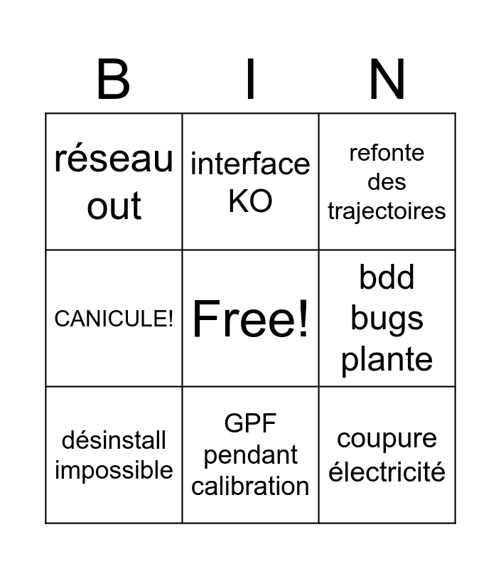 This bingo card has a free space and 8 words: bdd bugs plante, refonte des trajectoires, interface KO, désinstall impossible, réseau out, coupure électricité, CANICULE! and GPF pendant calibration.