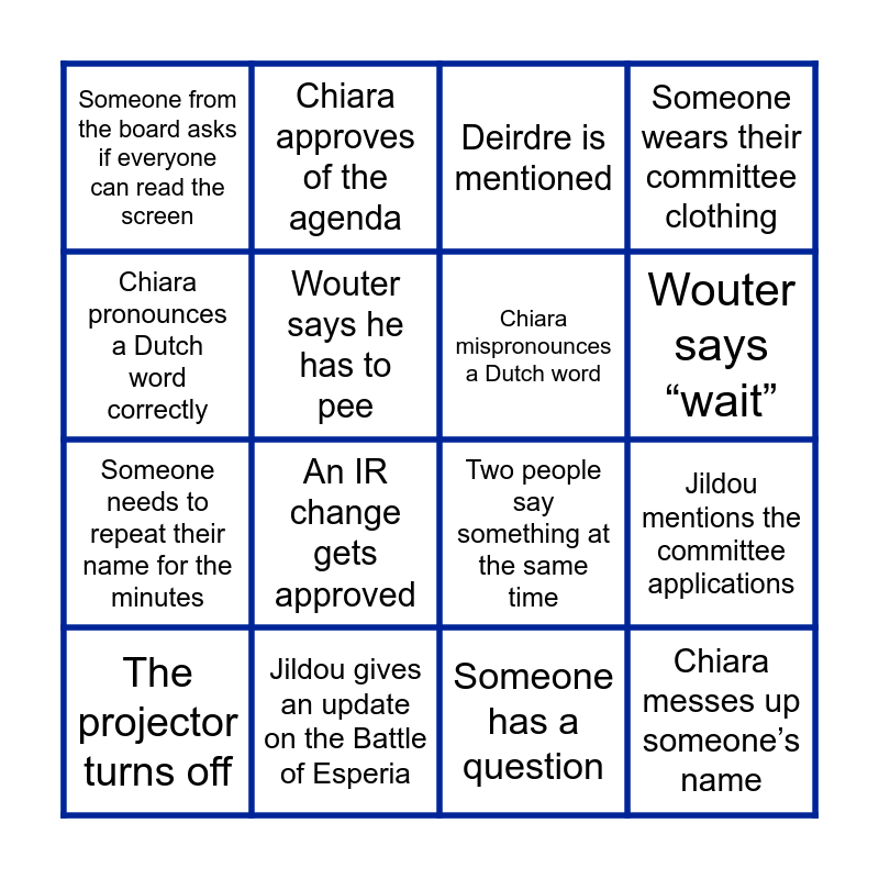 This bingo card has 34 words: Someone is late, Someone still needs to sign the attendance list, Lina messes up a number, Lina mentions €389.07, Chiara messes up someone’s name, Chiara mispronounces a Dutch word, Chiara pronounces a Dutch word correctly, Chiara opens the GMA, Chiara approves of the agenda, Someone from the board takes off their suit jacket, Wouter says “wait”, Deirdre is mentioned, Someone from the board finishes a beer, Jildou zones out, Jildou gives an update on the Battle of Esperia, An IR change gets approved, Roelieke speed-runs through her Kascie statement, Two people say something at the same time, Christoph screams HALLO, Someone says “who’s Joe?”, Someone complains that it’s warm, Chiara proposes a break, Someone from the board asks if everyone can read the screen, Someone has a question, Someone has to come to the front two times in a row, The projector turns off, Someone wears their committee clothing, A photo is on the slides, Someone needs to repeat their name for the minutes, Wouter says he has to pee, Jildou sings a song, Jildou mentions the committee applications, Chiara asks to put something to a vote and Jildou messes up something in Dutch.