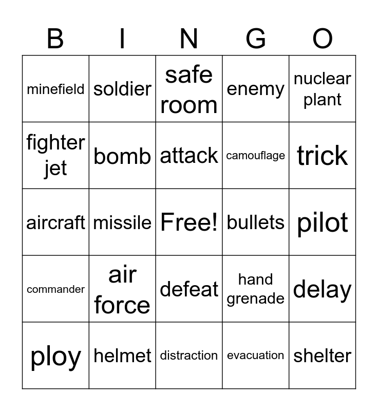 This bingo card has a free space and 24 words: air force, helmet, attack, ploy, nuclear plant, minefield, fighter jet, soldier, bullets, defeat, camouflage, aircraft, hand grenade, delay, bomb, evacuation, pilot, safe room, trick, missile, shelter, commander, enemy and distraction.