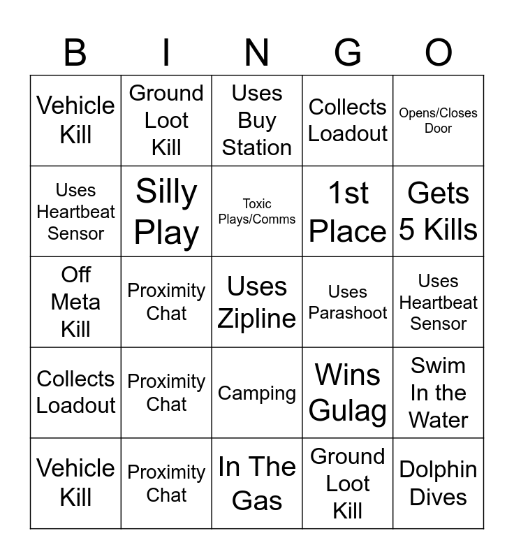 This bingo card has 75 words: Completes a Contract, Uses Self-Revive, Toxic Plays/Comms, Drives a Vehicle, Silly Play, Get A Vehicle Kill, Uses Killstreak, Off Meta Kill, Wins Gulag, Uses Buy Station, Dolphin Dives, Uses Parashoot, Camping, 1st Place, Equipment Kill/Finish, Uses Heartbeat Sensor, Proximity Chat, In The Gas, Meta Kill, Gets 5 Kills, Uses Ammo Box, Ground Loot Kill, Uses Zipline, Collects Loadout, Opens/Closes Door, Uses Self-Revive, Silly Play, Gets 5 Kills, Completes a Contract, Toxic Plays/Comms, Drives a Vehicle, Camping, Uses Killstreak, Wins Gulag, Uses Heartbeat Sensor, Vehicle Kill, Uses Ammo Box, Finds a key card, Uses Parashoot, Dolphin Dives, Off Meta Kill, In The Gas, Meta Kill, Uses Zipline, Swim In the Water, Collects Loadout, Proximity Chat, Uses Buy Station, Ground Loot Kill, 1st Place, Uses Self-Revive, Silly Play, Gets 5 Kills, Completes a Contract, Toxic Plays/Comms, Drives a Vehicle, Camping, Uses Killstreak, Wins Gulag, Uses Heartbeat Sensor, Vehicle Kill, Uses Ammo Box, Finds a key card, Uses Parashoot, Dolphin Dives, Off Meta Kill, In The Gas, Meta Kill, Uses Zipline, Swim In the Water, Collects Loadout, Proximity Chat, Uses Buy Station, Ground Loot Kill and 1st Place.