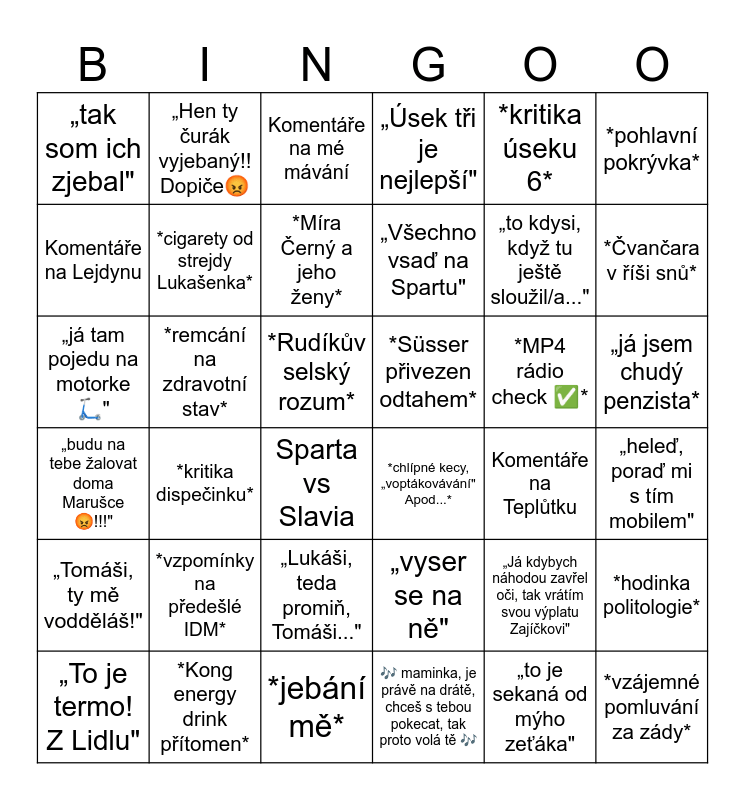 This bingo card has 36 words: „vyser se na ně", „Lukáši, teda promiň, Tomáši...", 🎶 maminka, je právě na drátě, chceš s tebou pokecat, tak proto volá tě 🎶, Komentáře na Lejdynu, „budu na tebe žalovat doma Marušce😡!!!", *Süsser přivezen odtahem*, *cigarety od strejdy Lukašenka*, *jebání mě*, *kritika úseku 6*, „Já kdybych náhodou zavřel oči, tak vrátím svou výplatu Zajíčkovi", *Čvančara v říši snů*, „Úsek tři je nejlepší", *hodinka politologie*, *remcání na zdravotní stav*, „Všechno vsaď na Spartu", „tak som ich zjebal", „Tomáši, ty mě vodděláš!", *MP4 rádio check ✅*, „já tam pojedu na motorke🛴", Komentáře na mé mávání, *Rudíkův selský rozum*, *kritika dispečinku*, *chlípné kecy, „voptákovávání" Apod...*, Sparta vs Slavia, Komentáře na Teplůtku, „Hen ty čurák vyjebaný!! Dopiče😡, „to kdysi, když tu ještě sloužil/a...", *Kong energy drink přítomen*, *Míra Černý a jeho ženy*, *pohlavní pokrývka*, *vzájemné pomluvání za zády*, „To je termo! Z Lidlu", „heleď, poraď mi s tím mobilem", „já jsem chudý penzista*, *vzpomínky na předešlé IDM* and „to je sekaná od mýho zeťáka".
