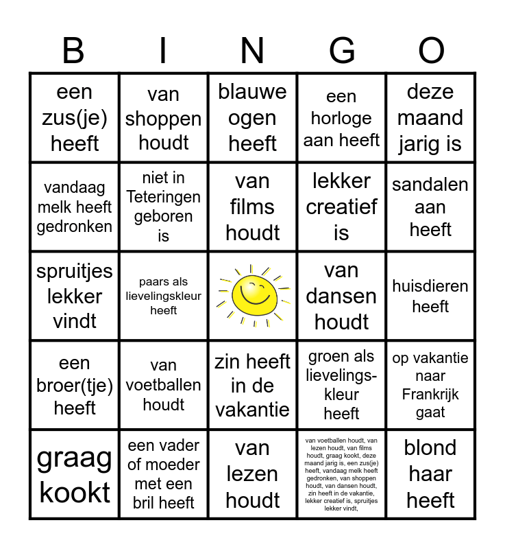 This bingo card has a free space and 25 words: van voetballen houdt, van lezen houdt, van films houdt, graag kookt, deze maand jarig is, een zus(je) heeft, vandaag melk heeft gedronken, van shoppen houdt, van dansen houdt, zin heeft in de vakantie, lekker creatief is, spruitjes lekker vindt, groen als lievelings-kleur heeft, op vakantie naar Frankrijk gaat, niet in Teteringen geboren is, graag tv kijkt, huisdieren heeft, blauwe ogen heeft, sandalen aan heeft, paars als lievelingskleur heeft, blond haar heeft, een vader of moeder met een bril heeft, een broer(tje) heeft, een horloge aan heeft and van voetballen houdt, van lezen houdt, van films houdt, graag kookt, deze maand jarig is, een zus(je) heeft, vandaag melk heeft gedronken, van shoppen houdt, van dansen houdt, zin heeft in de vakantie, lekker creatief is, spruitjes lekker vindt,.