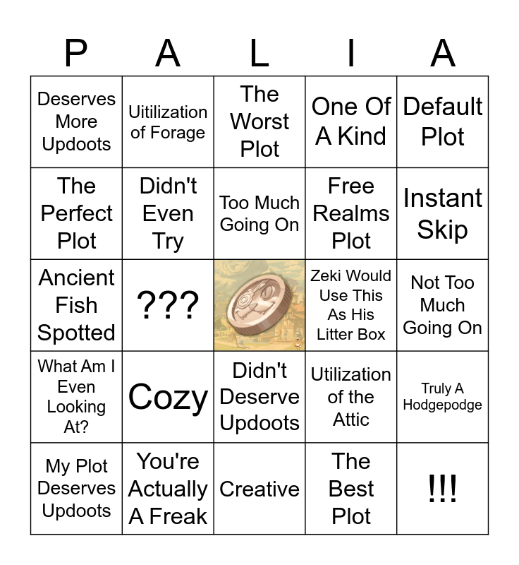This bingo card has a free space and 24 words: Cozy, You're Actually A Freak, Too Much Going On, My Plot Deserves Updoots, Default Plot, Deserves More Updoots, The Perfect Plot, Uitilization of Forage, Zeki Would Use This As His Litter Box, Didn't Deserve Updoots, Free Realms Plot, Ancient Fish Spotted, Utilization of the Attic, Truly A Hodgepodge, Didn't Even Try, The Best Plot, Not Too Much Going On, The Worst Plot, Instant Skip, ???, !!!, What Am I Even Looking At?, One Of A Kind and Creative.