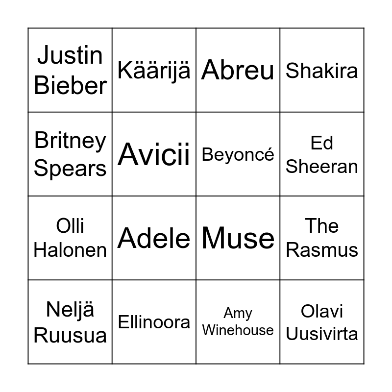 This bingo card has 18 words: Adele, Olavi Uusivirta, Abreu, Justin Bieber, Muse, Shakira, Neljä Ruusua, Käärijä, Ed Sheeran, Olli Halonen, Amy Winehouse, Britney Spears, The Rasmus, Avicii, Beyoncé, Nylon Beat, Ellinoora and The Crash.