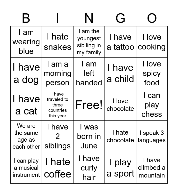 This bingo card has a free space and 24 words: I have 2 siblings, I hate coffee, I am left handed, I can play a musical instrument, I love cooking, I am wearing blue, I have a dog, I hate snakes, I love chocolate, I was born in June, I have a child, I have a cat, I hate chocolate, I speak 3 languages, I am a morning person, I play a sport, I can play chess, I am the youngest sibiling in my family, I love spicy food, I have traveled to three countries this year, I have climbed a mountain, We are the same age as each other, I have a tattoo and I have curly hair.