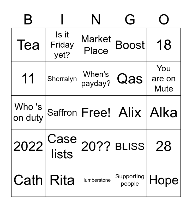 This bingo card has a free space and 24 words: Case lists, Rita, When's payday?, Cath, 18, Tea, 11, Is it Friday yet?, Alix, 20??, Qas, Who 's on duty, BLISS, 28, Sherralyn, Supporting people, Alka, Market Place, You are on Mute, Saffron, Hope, 2022, Boost and Humberstone.