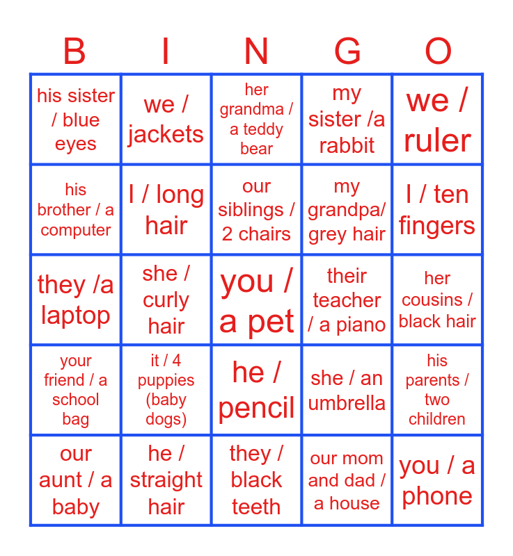 This bingo card has a free space and 27 words: she / an umbrella, my grandparents / 8 cows, my grandpa/ grey hair, they / black teeth, his brother / a computer, her grandma / a teddy bear, we / jackets, your friend / a school bag, their teacher / a piano, his parents / two children, they /a laptop, my sister /a rabbit, our aunt / a baby, he / straight hair, I / ten fingers, their uncle / a car, I / long hair, our siblings / 2 chairs, it / 4 puppies (baby dogs), his sister / blue eyes, her cousins / black hair, our mom and dad / a house, she / curly hair, you / a phone, he / pencil, we / ruler and they / friends.