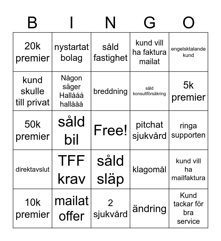 This bingo card has a free space and 25 words: TFF krav, 2 sjukvård, breddning, 10k premier, engelsktalande kund, 20k premier, kund skulle till privat, nystartat bolag, pitchat sjukvård, såld släp, såld konsultförsäkring, 50k premier, klagomål, kund vill ha mailfaktura, Någon säger Hallååå hallååå, Skador ringer till oss, ringa supporten, såld fastighet, 5k premier, såld bil, Kund tackar för bra service, mailat offer, direktavslut, kund vill ha faktura mailat and ändring.