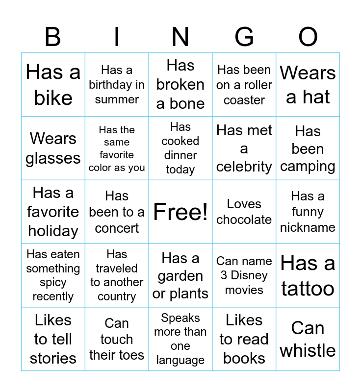 This bingo card has a free space and 50 words: Has a pet, Can whistle, Born in the same month as you, Speaks more than one language, Has traveled to another country, Likes ice cream, Has a birthday in summer, Knows a joke, Wears glasses, Can sing a song, Has the same favorite color as you, Has been on a roller coaster, Has a tattoo, Can name 3 Disney movies, Has a sibling, Likes to dance, Has cooked dinner today, Loves chocolate, Has a smartphone, Wears a hat, Has been to a concert, Likes to read books, Has a bike, Has met a celebrity, Can do a magic trick, Has a favorite superhero, Has been camping, Loves to sing in the shower, Has broken a bone, Has a garden or plants, Likes to play video games, Loves pizza, Can name 3 animals that live in the ocean, Has a favorite movie, Can touch their toes, Knows how to swim, Has played a musical instrument, Has worn pajamas today, Likes to draw or paint, Has a funny nickname, Likes to bake, Has traveled by plane, Has more than 2 cousins, Has been to the beach this year, Likes to tell stories, Has a favorite holiday, Has a collection (stamps, coins, toys, etc.), Can do a funny dance move, Has eaten something spicy recently and Can speak more than one language.