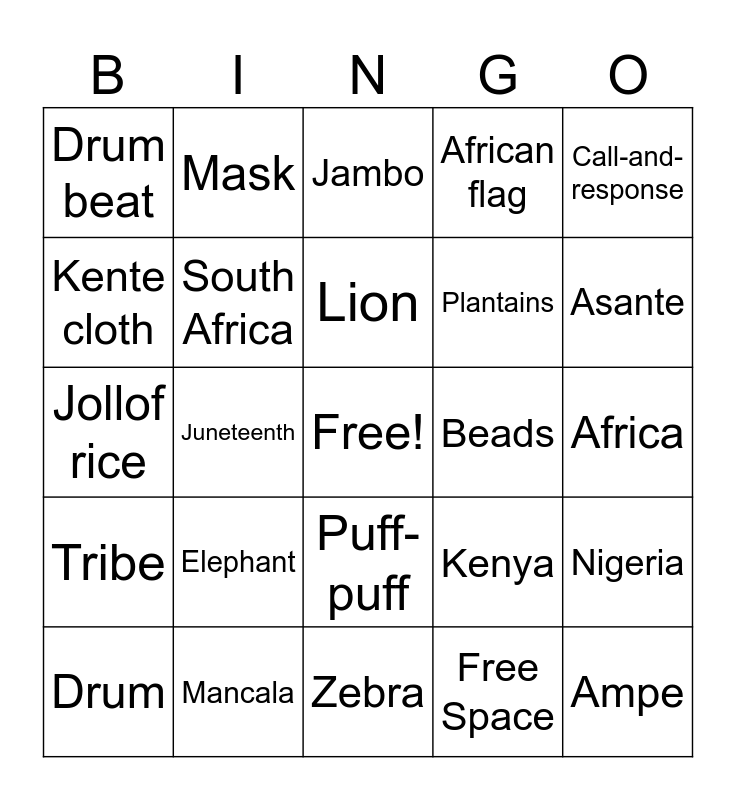 This bingo card has a free space and 25 words: Elephant, Zebra, Lion, Drum, Call-and-response, Drum beat, Kente cloth, Mask, Beads, Puff-puff, Plantains, Jollof rice, Kenya, Nigeria, South Africa, Ghana, Africa, Jambo, Asante, Juneteenth, Ampe, Mancala, Tribe, African flag and Free Space.