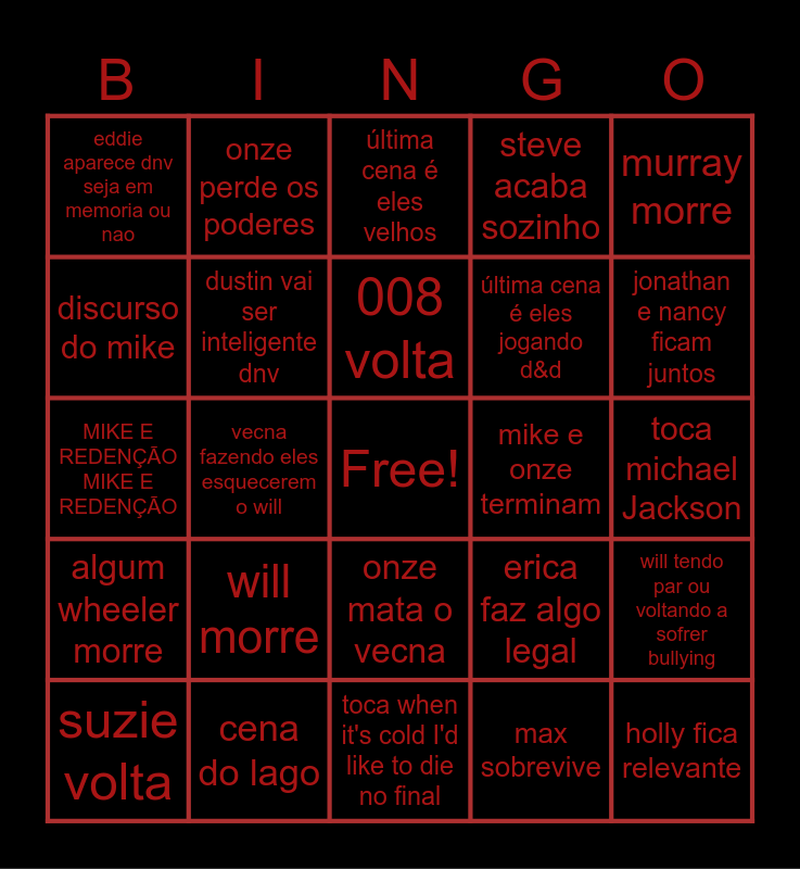 This bingo card has a free space and 24 words: will morre, cena do lago, 008 volta, suzie volta, murray morre, eddie aparece dnv seja em memoria ou nao, discurso do mike, onze perde os poderes, mike e onze terminam, onze mata o vecna, última cena é eles jogando d&d, MIKE E REDENÇÃO MIKE E REDENÇÃO, erica faz algo legal, will tendo par ou voltando a sofrer bullying, dustin vai ser inteligente dnv, max sobrevive, toca michael Jackson, última cena é eles velhos, jonathan e nancy ficam juntos, vecna fazendo eles esquecerem o will, holly fica relevante, algum wheeler morre, steve acaba sozinho and toca when it's cold I'd like to die no final.