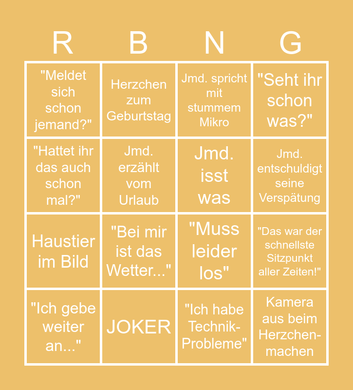 This bingo card has 28 words: "Ich möchte sensibili-sieren", Kind im Bild, Haustier im Bild, Jmd. erzählt vom Wochenende, Jmd. erzählt vom Urlaub, Jmd. spricht mit stummem Mikro, Herzchen zum Geburtstag, Kamera aus beim Herzchen-machen, JOKER, Schwanger-schaft, "Muss leider los", "Seht ihr schon was?", "Wir hören dich nicht!", Jmd. startet den Termin >5 Minuten früher, "Bei mir ist das Wetter...", "Habt ihr das auch, dass...?", "Synergien schaffen", Jmd. isst was, Jmd. entschuldigt seine Verspätung, "Ich eröffne damit die Runde", "Meldet sich schon jemand?", "Wer ist als Nächstes?", "Ich gebe weiter an...", "Das war der schnellste Sitzpunkt aller Zeiten!", "Ich habe Technik-Probleme", "Kann mich jemand dazuholen?", "Hattet ihr das auch schon mal?" and "Das war mal eine schnelle Runde".