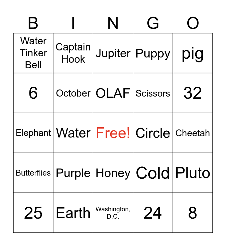 This bingo card has a free space and 24 words: Purple, Earth, OLAF, 25, pig, Water Tinker Bell, 6, Captain Hook, Circle, Honey, Scissors, Elephant, Cold, Pluto, October, 24, Cheetah, Jupiter, 32, Water, 8, Butterflies, Puppy and Washington, D.C..