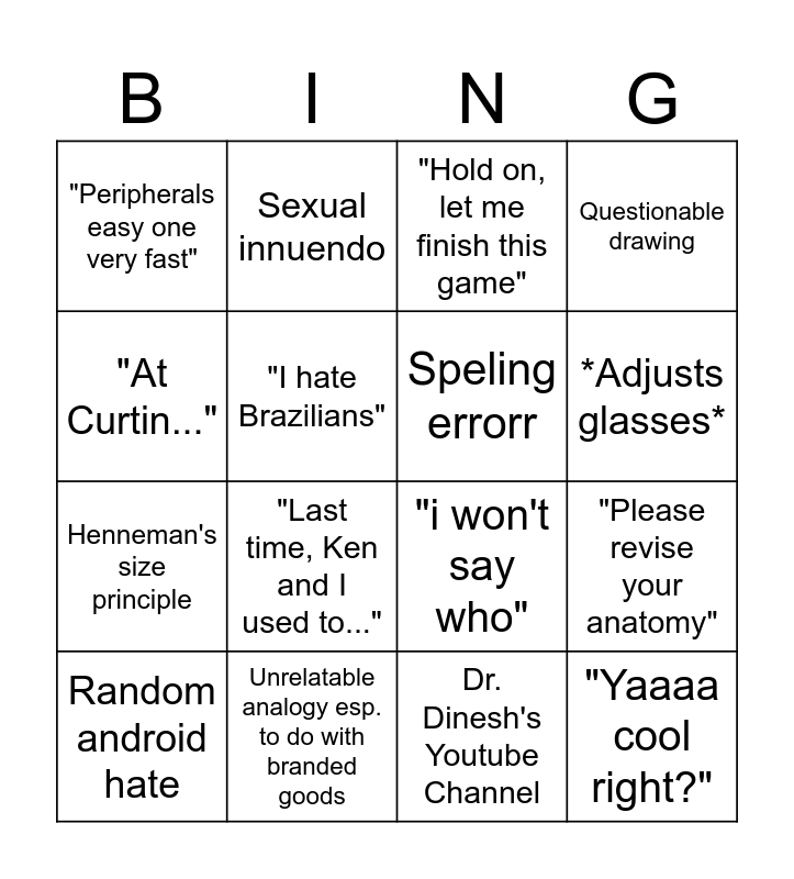 This bingo card has 16 words: Unrelatable analogy esp. to do with branded goods, "Please revise your anatomy", "Hold on, let me finish this game", "Peripherals easy one very fast", Henneman's size principle, Sexual innuendo, "i won't say who", Dr. Dinesh's Youtube Channel, "At Curtin...", "I hate Brazilians", Random android hate, Questionable drawing, "Last time, Ken and I used to...", *Adjusts glasses*, Speling errorr and "Yaaaa cool right?".