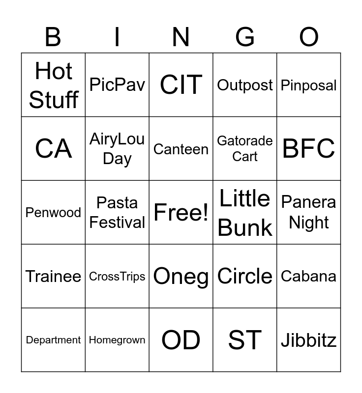 This bingo card has a free space and 28 words: Cabana, Blurple, Gatorade Cart, ST, CA, CIT, PicPav, Trainee, Little Bunk, Department, Penwood, Outpost, Homegrown, OD, BFC, UC, CrossTrips, AiryLou Day, Canteen, Oneg, Hot Stuff, Tilly’s Corner, Jibbitz, Pasta Festival, Panera Night, Circle, Pinposal and Med Shed.