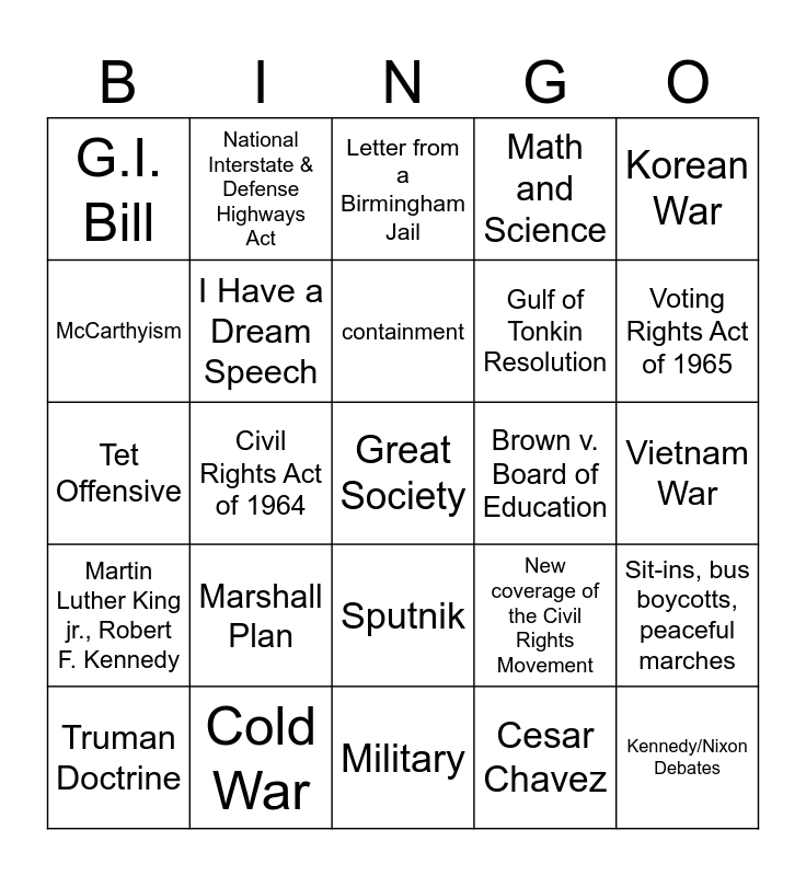This bingo card has a free space and 24 words: Marshall Plan, Cold War, containment, Truman Doctrine, Korean War, G.I. Bill, McCarthyism, National Interstate & Defense Highways Act, Brown v. Board of Education, Sputnik, Gulf of Tonkin Resolution, Tet Offensive, New coverage of the Civil Rights Movement, Sit-ins, bus boycotts, peaceful marches, I Have a Dream Speech, Cesar Chavez, Vietnam War, Letter from a Birmingham Jail, Voting Rights Act of 1965, Civil Rights Act of 1964, Kennedy/Nixon Debates, Martin Luther King jr., Robert F. Kennedy, Math and Science and Military.