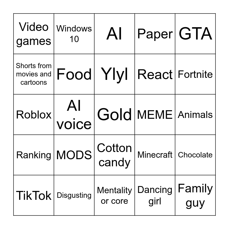 This bingo card has 25 words: Ranking, Disgusting, Gold, Dancing girl, GTA, Video games, Windows 10, AI, MEME, Chocolate, Shorts from movies and cartoons, Food, Mentality or core, Minecraft, Fortnite, TikTok, AI voice, Ylyl, React, Animals, Roblox, MODS, Cotton candy, Paper and Family guy.