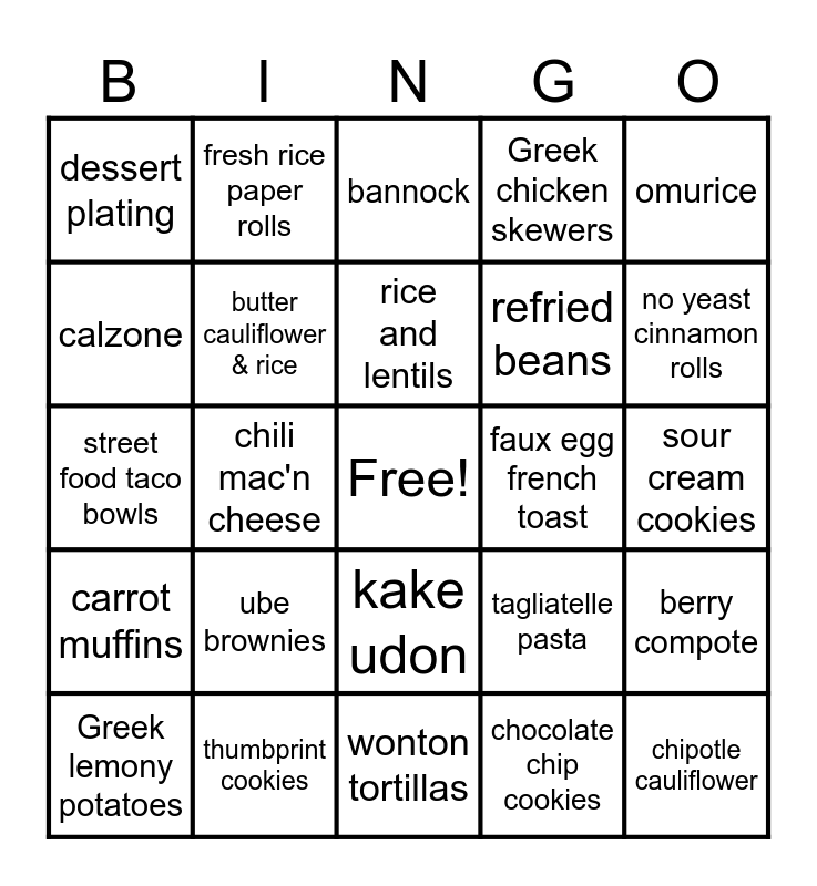 This bingo card has a free space and 27 words: tagliatelle pasta, bolognese sauce, refried beans, wonton tortillas, calzone, bannock, fresh rice paper rolls, carrot muffins, faux egg french toast, berry compote, street food taco bowls, Greek chicken skewers, Greek lemony potatoes, thumbprint cookies, no yeast cinnamon rolls, Breakfast congee, butter cauliflower & rice, rice and lentils, ube brownies, dessert plating, sour cream cookies, chocolate chip cookies, chili mac'n cheese, chipotle cauliflower, kake udon, omurice and spring onion pancake.