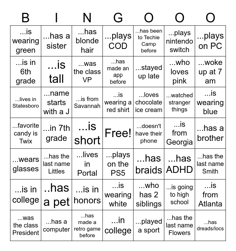 This bingo card has a free space and 48 words: ...who has 2 siblings, ...who loves pink, ...in college, ...in 7th grade, ...is from Savannah, ...has a brother, ...has a sister, ...has a computer, ...plays nintendo switch, ...plays on the PS5, ...plays on PC, ...plays COD, ...watched stranger things, ...loves chocolate ice cream, ...is in college, ...is from Georgia, ...is in 6th grade, ...woke up at 7 am, ...is going to high school, ...has been to Techie Camp before, ...stayed up late, ...is short, ...is wearing green, ...is tall, ...is from Atlanta, ...was the class VP, ...is wearing blue, ...was the class President, ...is wearing a red shirt, ...name starts with a J, ...has the last name Flowers, ...doesn't have their phone, ...has the last name Smith, ..has a pet, ...favorite candy is Twix, ...has braids, ...has ADHD, ...lives in Statesboro, ...lives in Portal, ...is in honors, ...wears glasses, ...has dreads/locs, ...has blonde hair, ...has made a retro game before, ...has made an app before, ...is wearing white, ...has the last name Littles and ...played a sport.
