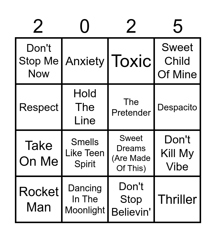 This bingo card has 18 words: Smells Like Teen Spirit, Thriller, Toxic, Don't Stop Me Now, Sweet Dreams (Are Made Of This), Sweet Child Of Mine, Rocket Man, Anxiety, Despacito, Take On Me, Don't Stop Believin', Respect, Don't Kill My Vibe, Hold The Line, The Pretender, Dancing On My Own, Dancing In The Moonlight and (I Can't Get No) Satisfaction.