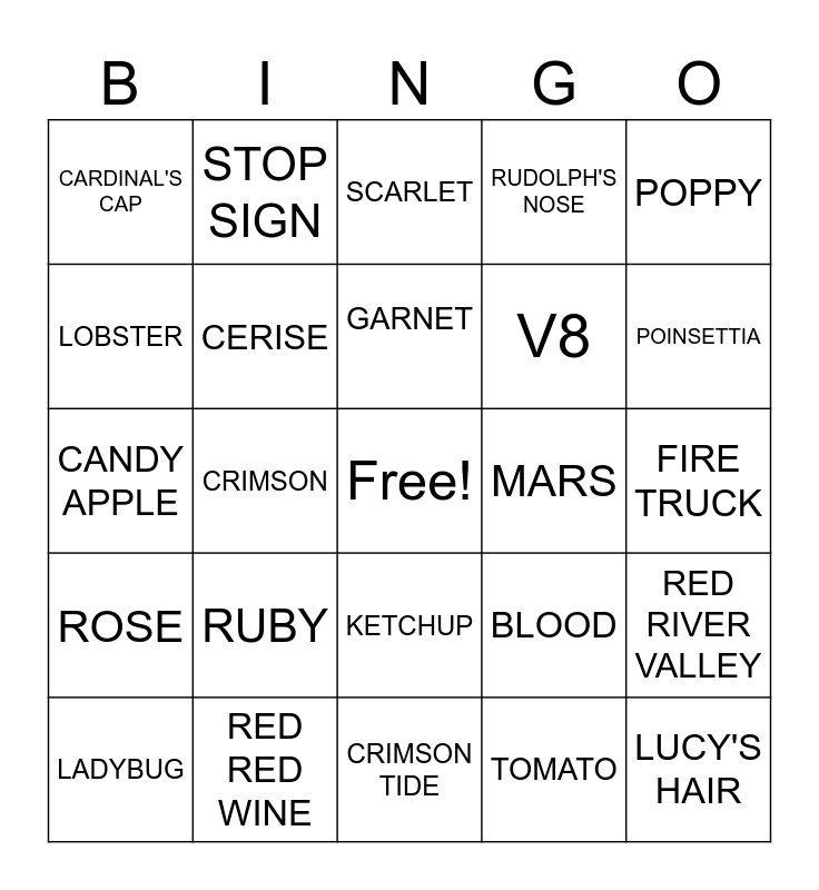 This bingo card has a free space and 34 words: CHERRY, TOMATO, SUPERMAN'S CAPE, FIRE HYDRANT, ROSE, CERISE, POPPY, LADYBUG, STOP SIGN, RADISH, GARNET, SCARLET, 99 RED BALOONS, CLOWN NOSE, MARS, POINSETTIA, RED RED WINE, CANDY APPLE, RUBY, BLOOD, KETCHUP, CERISE, CARDINAL'S CAP, FIRE TRUCK, CRIMSON TIDE, LUCY'S HAIR, RUDOLPH'S NOSE, RED CARPET, V8, LOBSTER, CRANBERRY, CRIMSON, RED RIVER VALLEY and LITTLE RED CORVETTE.