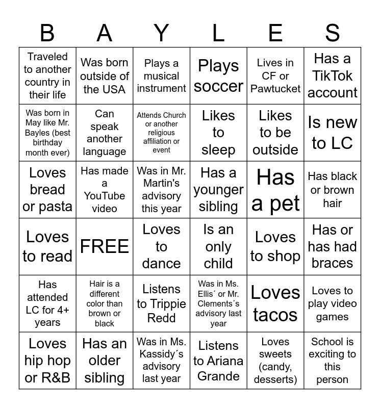 This bingo card has 36 words: Was in Ms. Ellis´ or Mr. Clements´s advisory last year, Listens to Trippie Redd, Listens to Ariana Grande, Was born in May like Mr. Bayles (best birthday month ever), Loves to read, Has a younger sibling, Can speak another language, Was in Ms. Kassidy´s advisory last year, Lives in CF or Pawtucket, Loves tacos, Is new to LC, Plays soccer, Loves to play video games, Has made a YouTube video, Likes to sleep, Traveled to another country in their life, Has attended LC for 4+ years, Has a pet, Loves bread or pasta, Plays a musical instrument, Was in Mr. Martin's advisory this year, FREE, Is an only child, Loves to dance, Loves to shop, Was born outside of the USA, Likes to be outside, Has an older sibling, Attends Church or another religious affiliation or event, Has a TikTok account, School is exciting to this person, Loves hip hop or R&B, Has or has had braces, Has black or brown hair, Hair is a different color than brown or black and Loves sweets (candy, desserts).