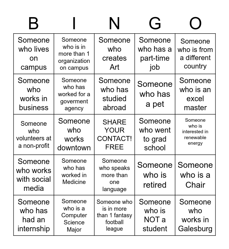 This bingo card has a free space and 29 words: Someone who has had an internship, Someone who is planning on going to law school, Someone who works downtown, Someone who serves on a Board of Directors, Someone who lives on campus, Someone who creates Art, Someone who has worked for a goverment agency, Someone who has worked in Medicine, Someone who went to grad school, Someone who is a Computer Science Major, Someone who is interested in renewable energy, Someone who works in Galesburg, Someone who is in more than 1 fantasy football league, Someone who is NOT a student, Someone who is an excel master, Someone who has a part time job, Someone who speaks more than one language, Someone who works with social media, Someone who is from a different country, Someone who volunteers at a non-profit, Someone who is retired, Someone who speaks Spanish, Someone who has a pet, Someone who works in business, Someone who has a part-time job, Someone who is in more than 1 organization on campus, Someone who is a Chair, Someone who has studied abroad and Someone who is currently a Junior.