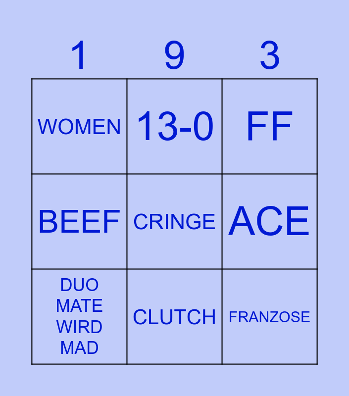 This bingo card has a free space and 8 words: ACE, FF, 13-0, DUO MATE WIRD MAD, WOMEN, FRANZOSE, BEEF and CLUTCH.